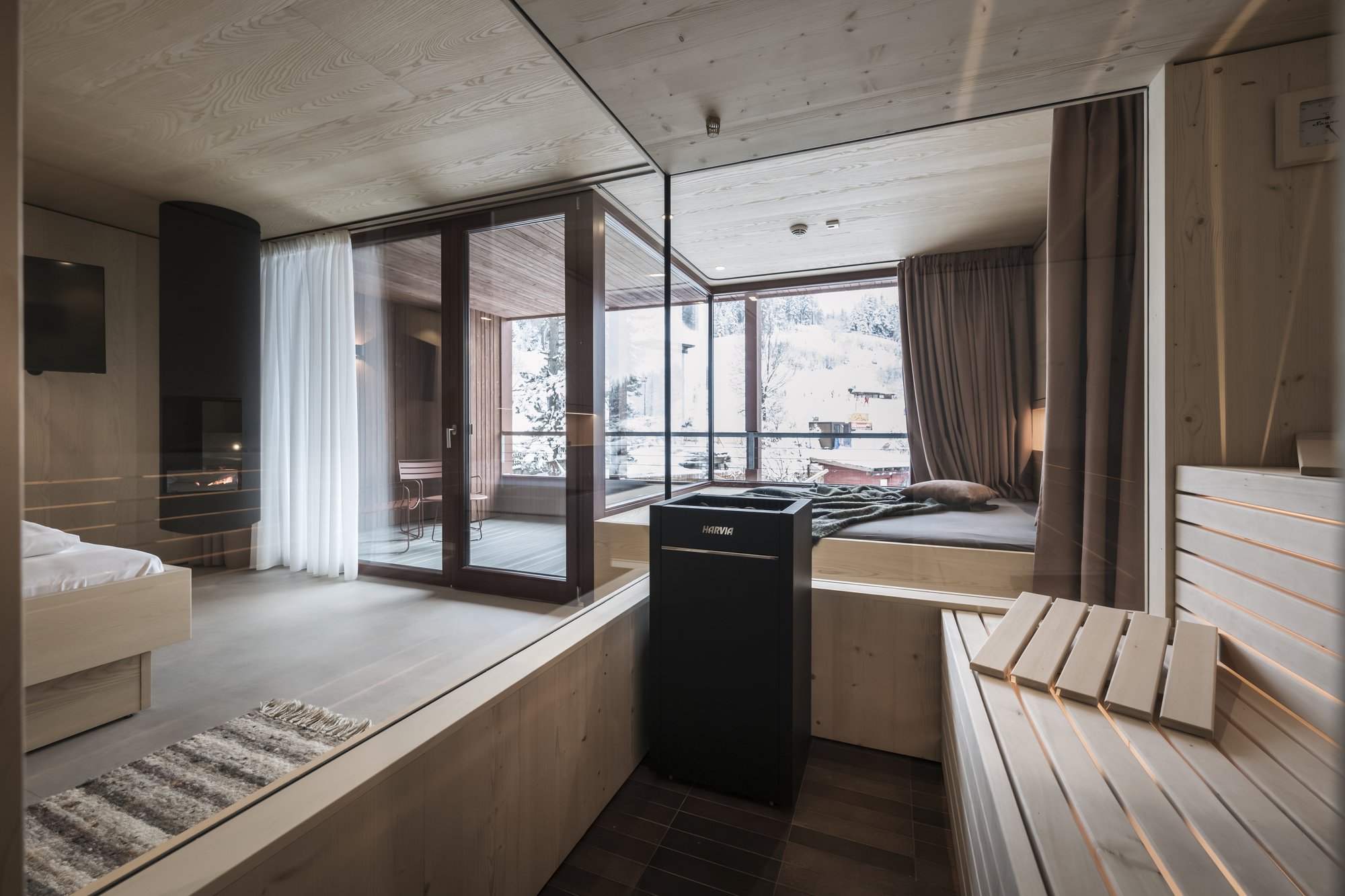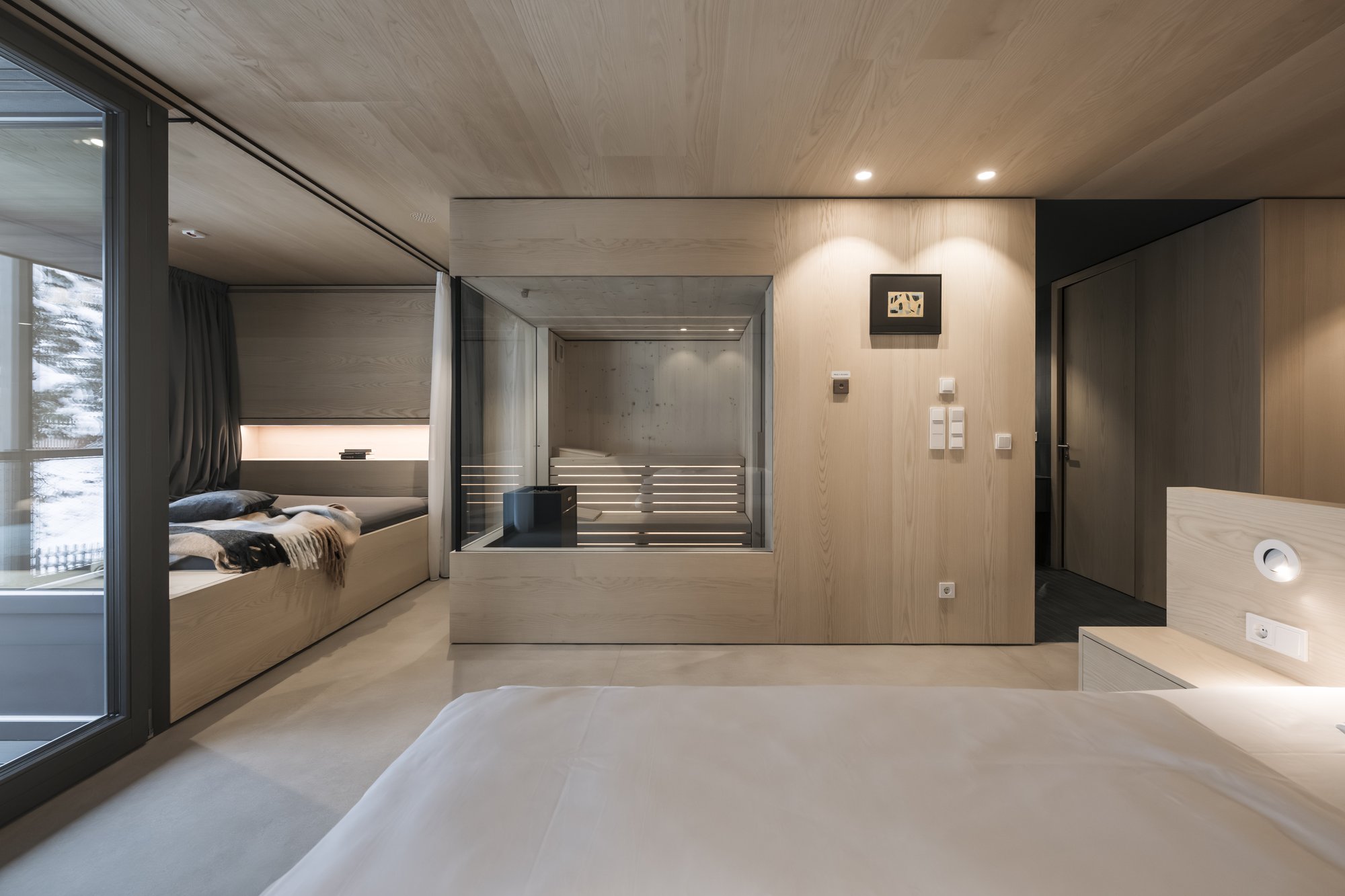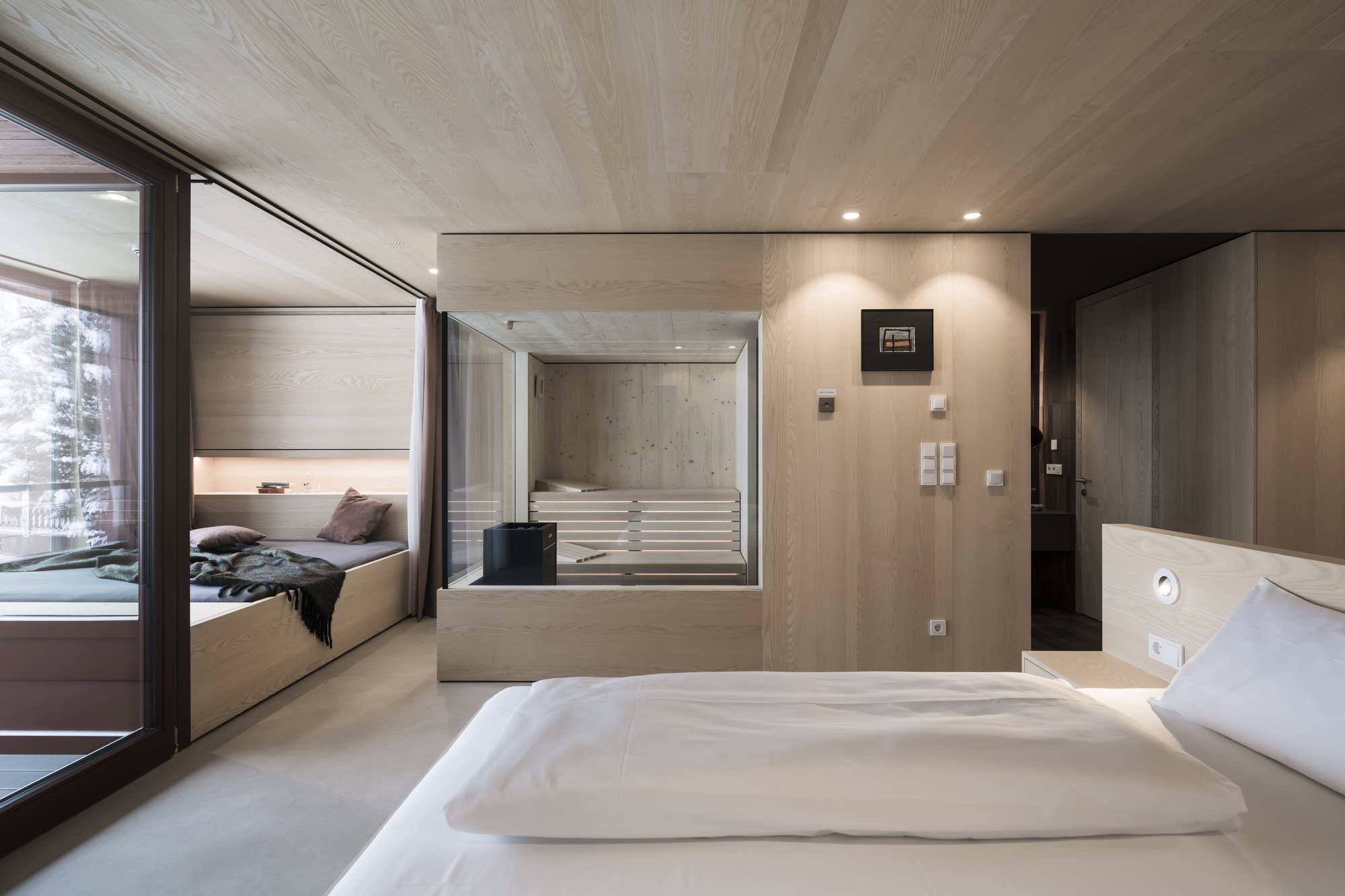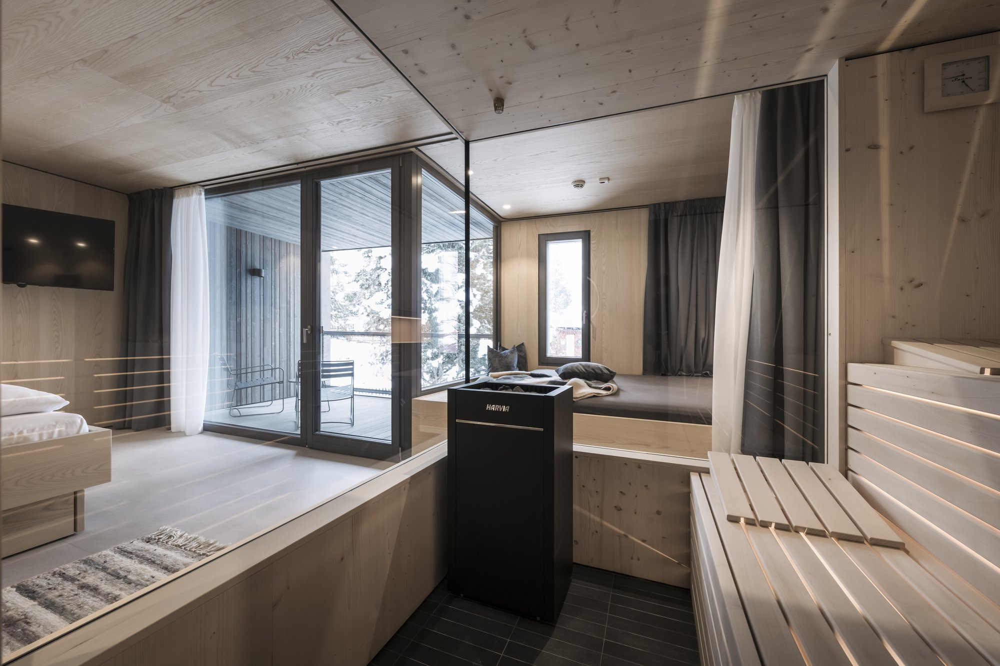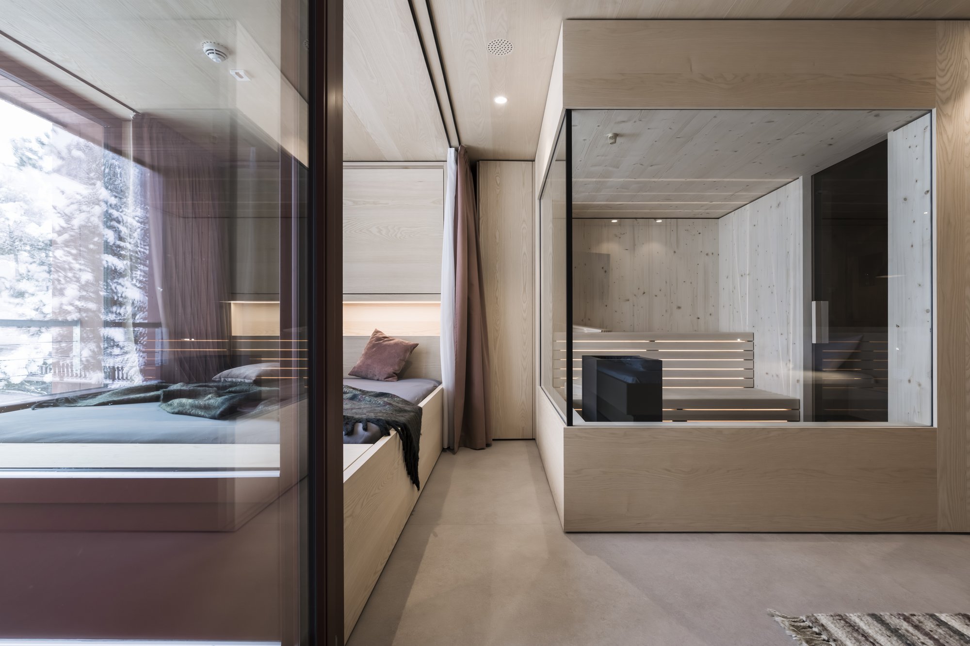 Sei apartsuite dispongono di una sauna privata che, grazie alla parete in vetro, al caldo legno e alla luce soffusa, si integra armoniosamente nello spazio abitativo risultando moderna e accogliente al tempo stesso.