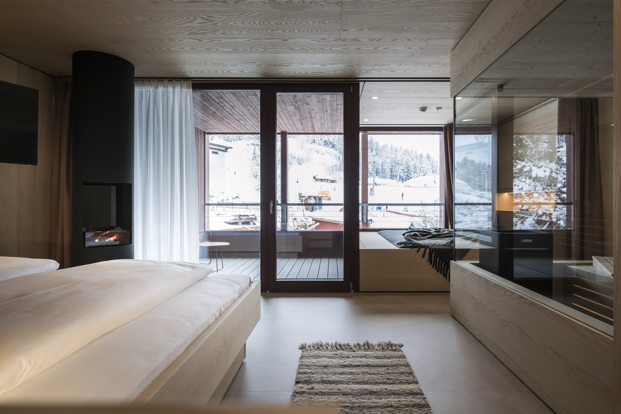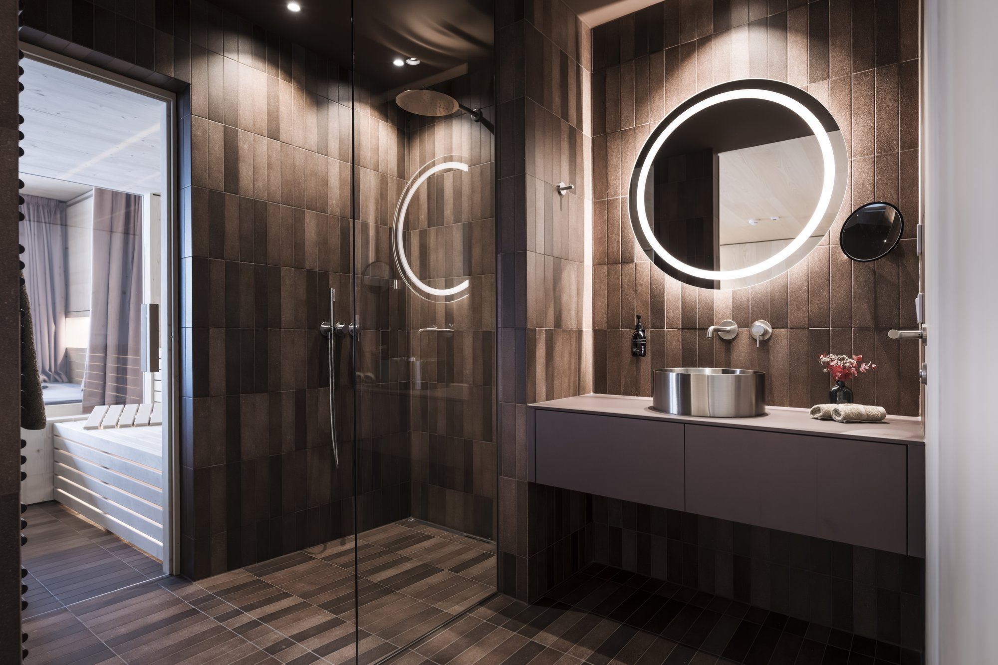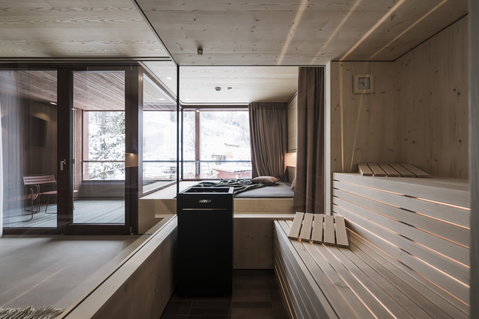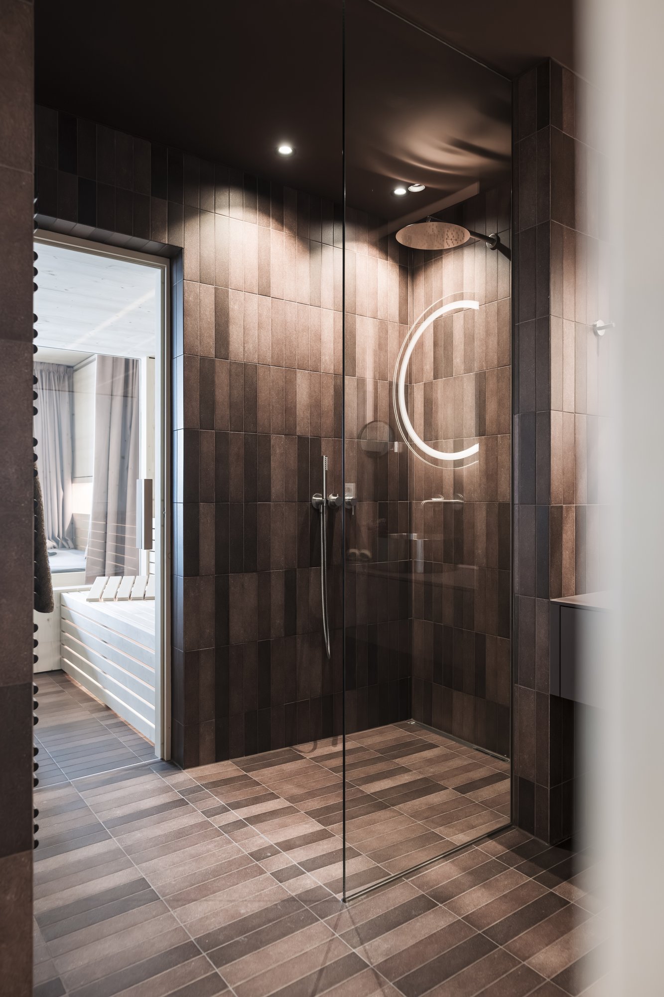 Sei apartsuite dispongono di una sauna privata che, grazie alla parete in vetro, al caldo legno e alla luce soffusa, si integra armoniosamente nello spazio abitativo risultando moderna e accogliente al tempo stesso.