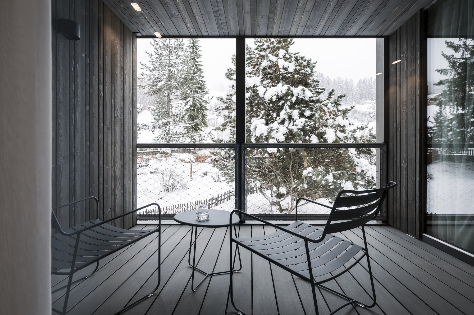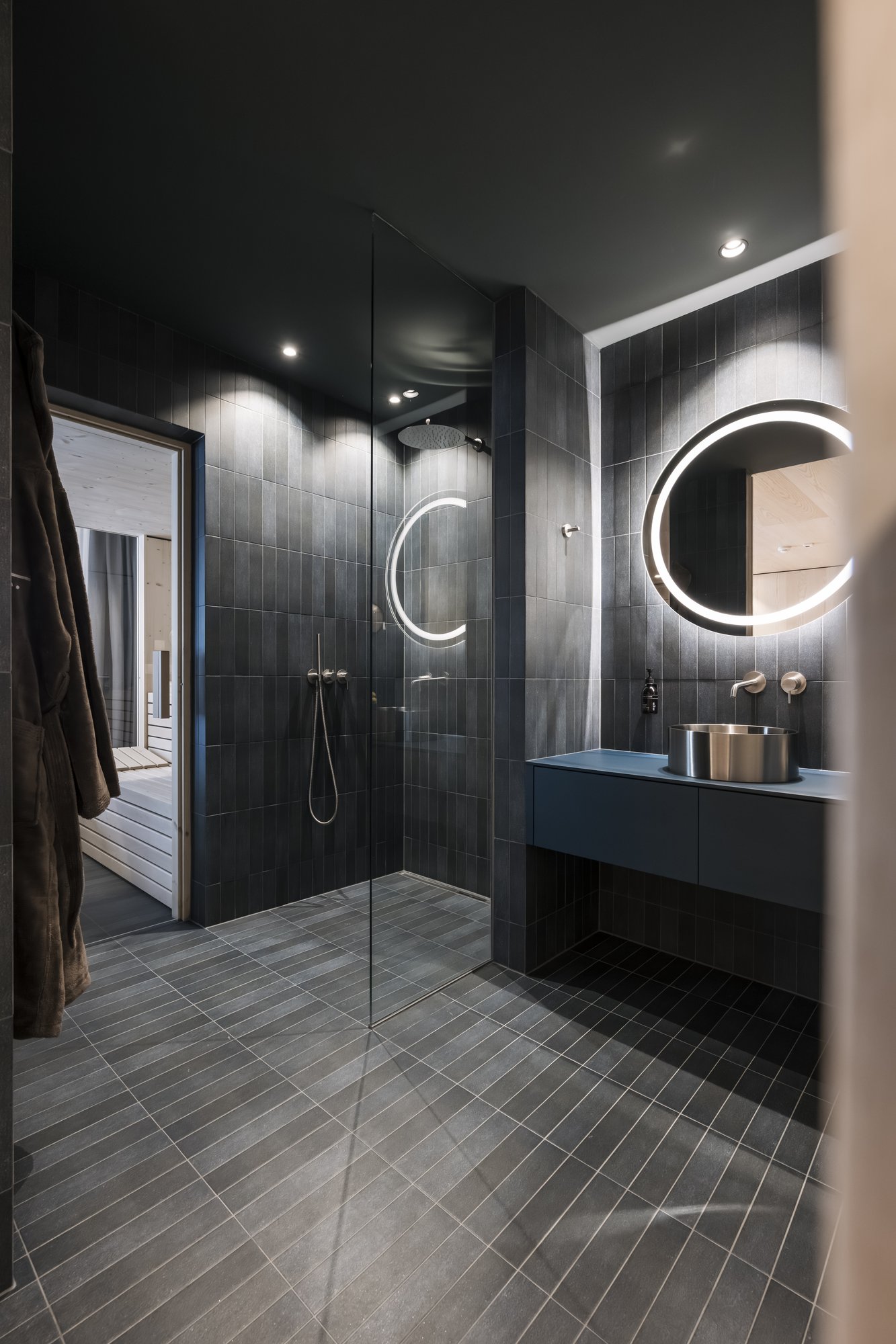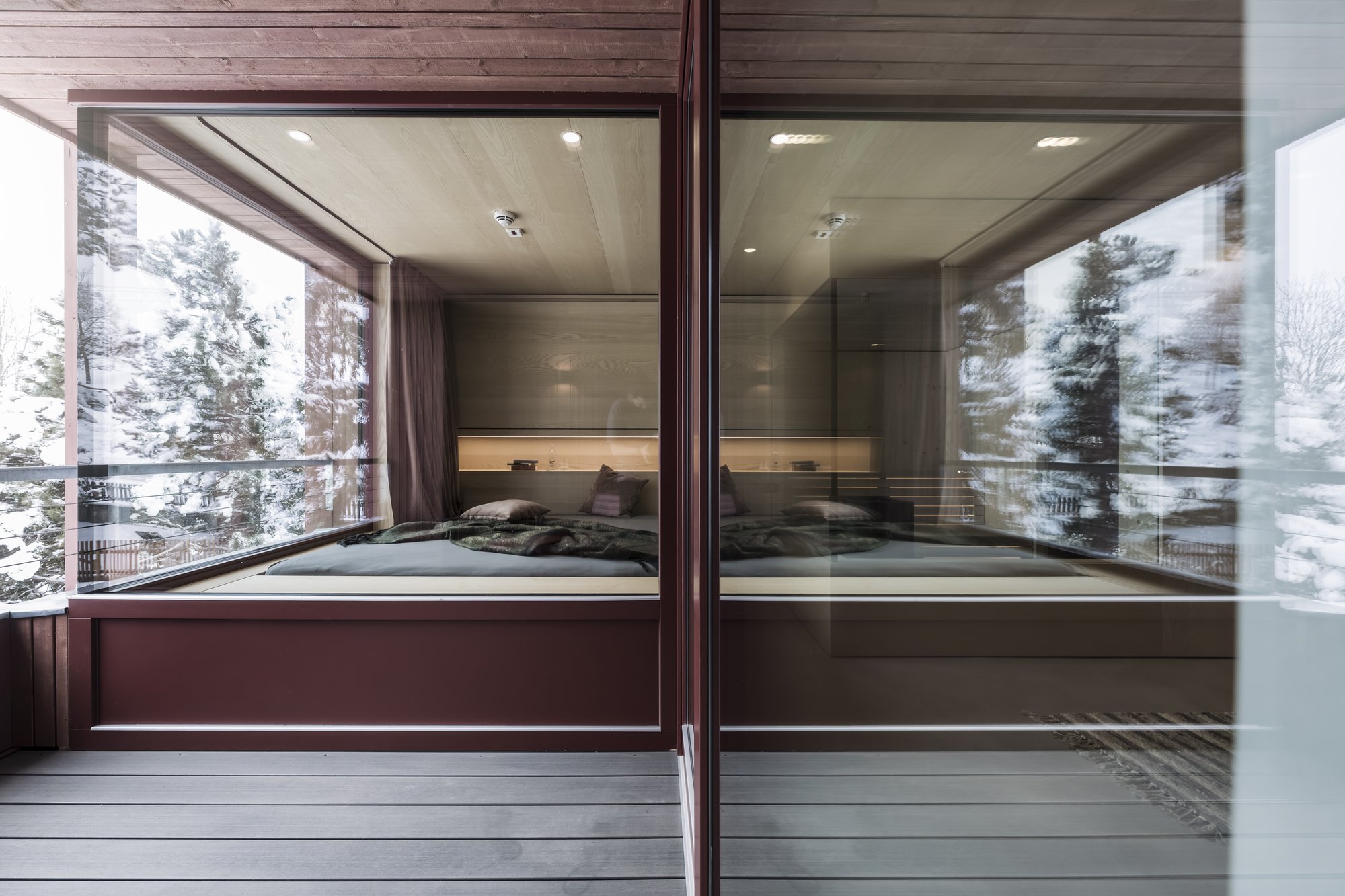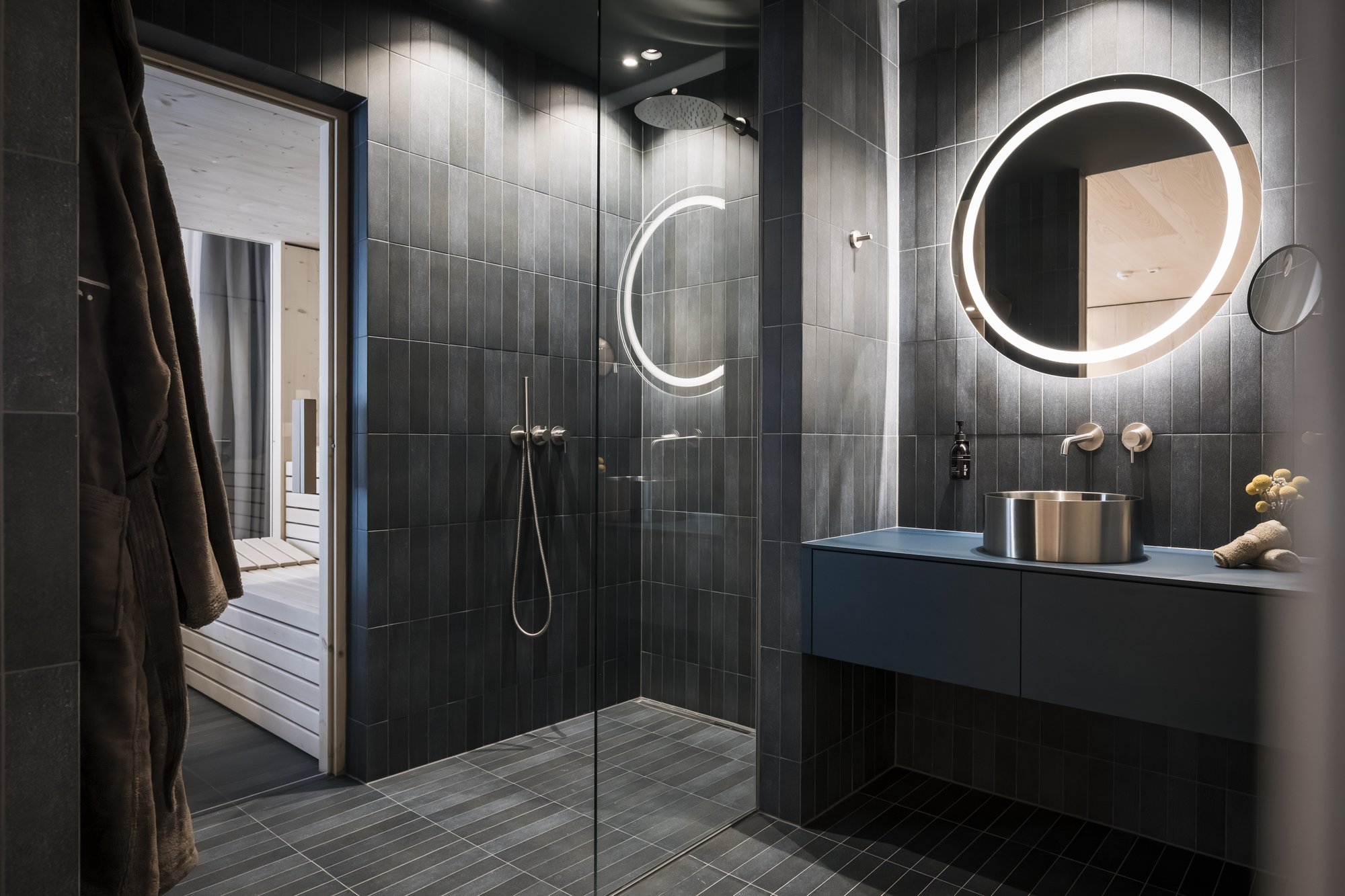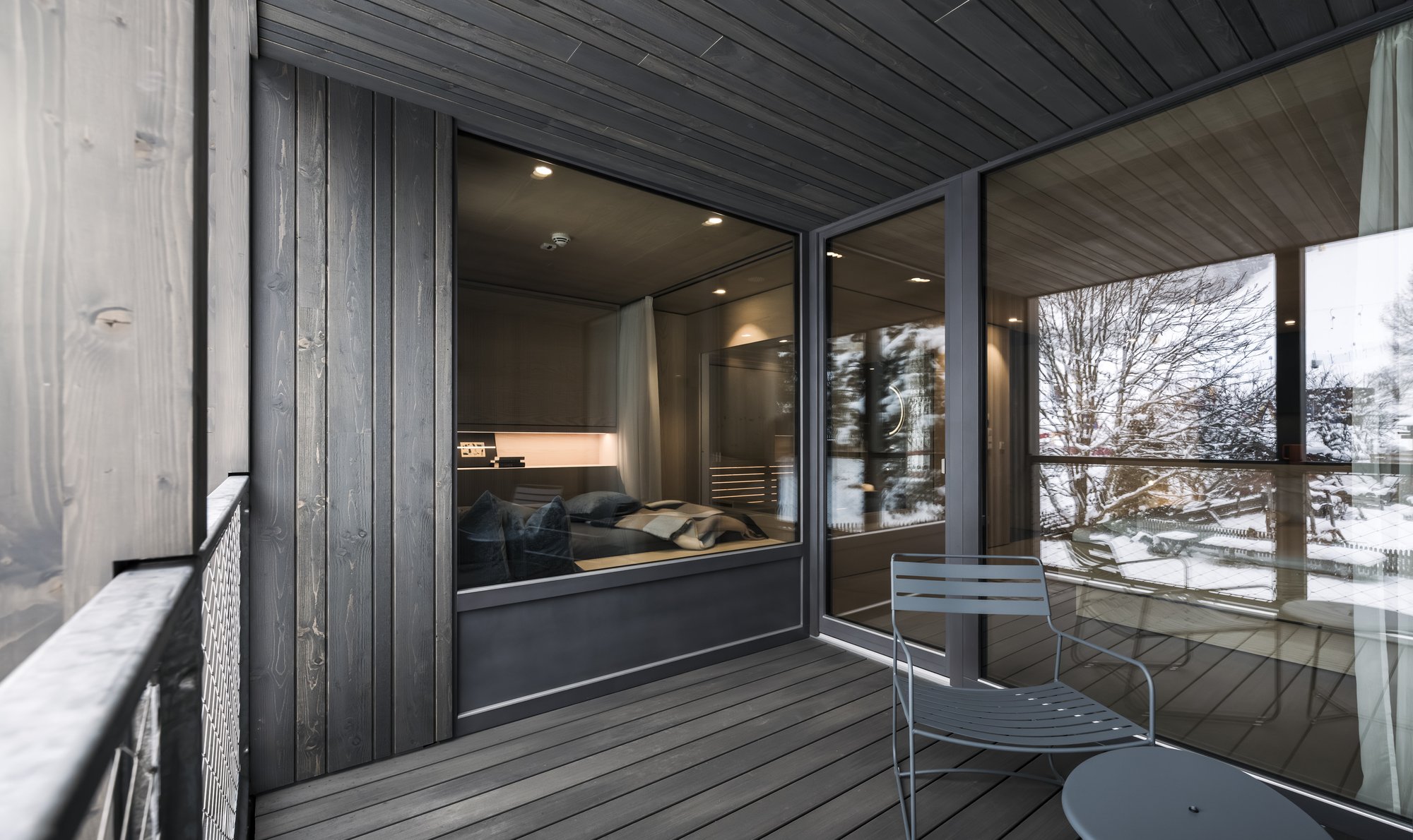 Sei apartsuite dispongono di una sauna privata che, grazie alla parete in vetro, al caldo legno e alla luce soffusa, si integra armoniosamente nello spazio abitativo risultando moderna e accogliente al tempo stesso.