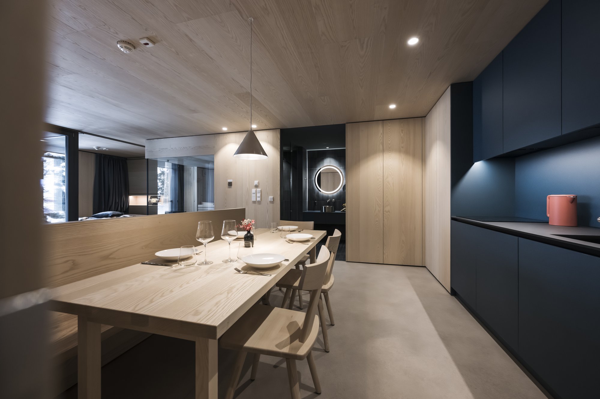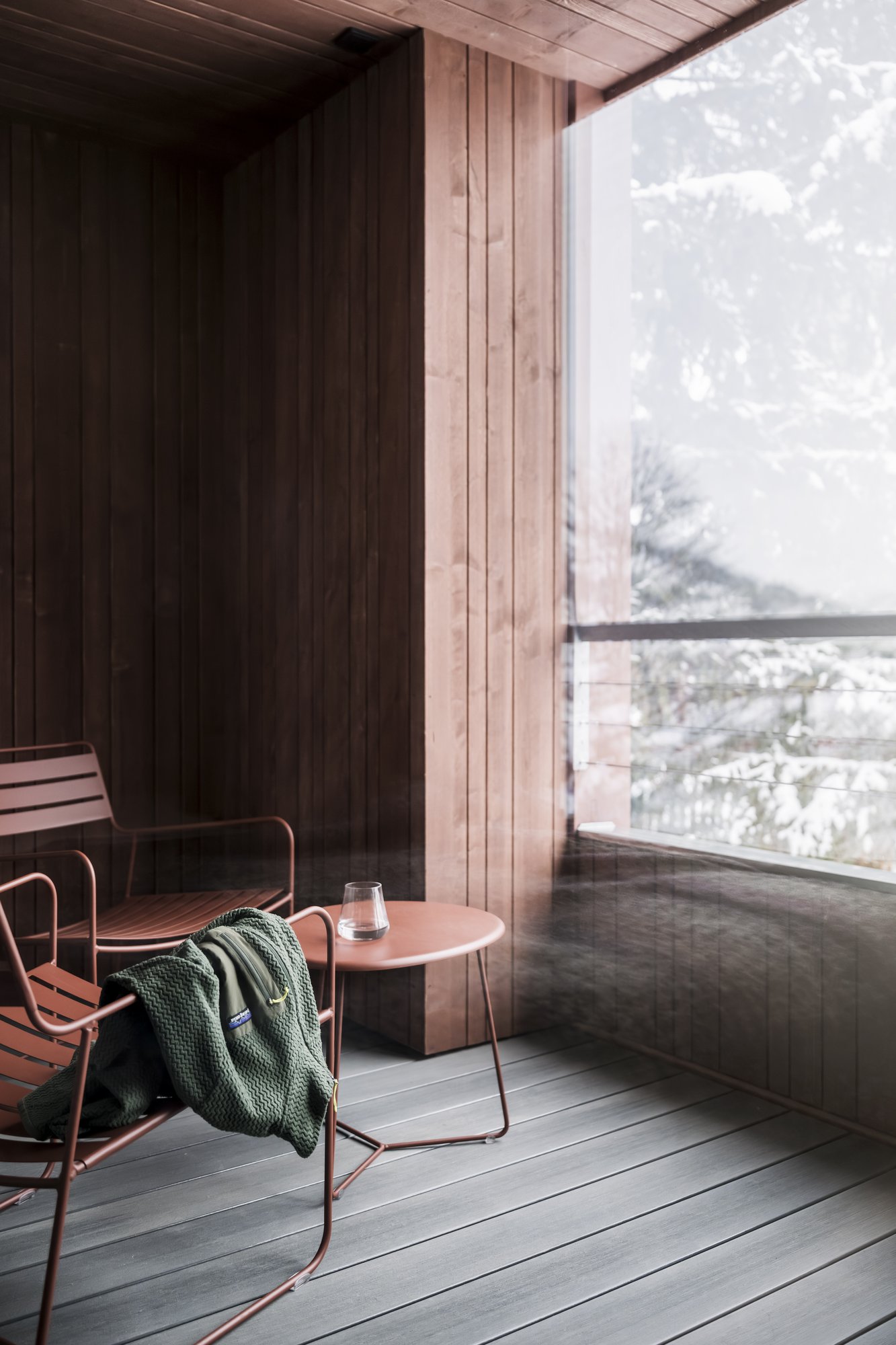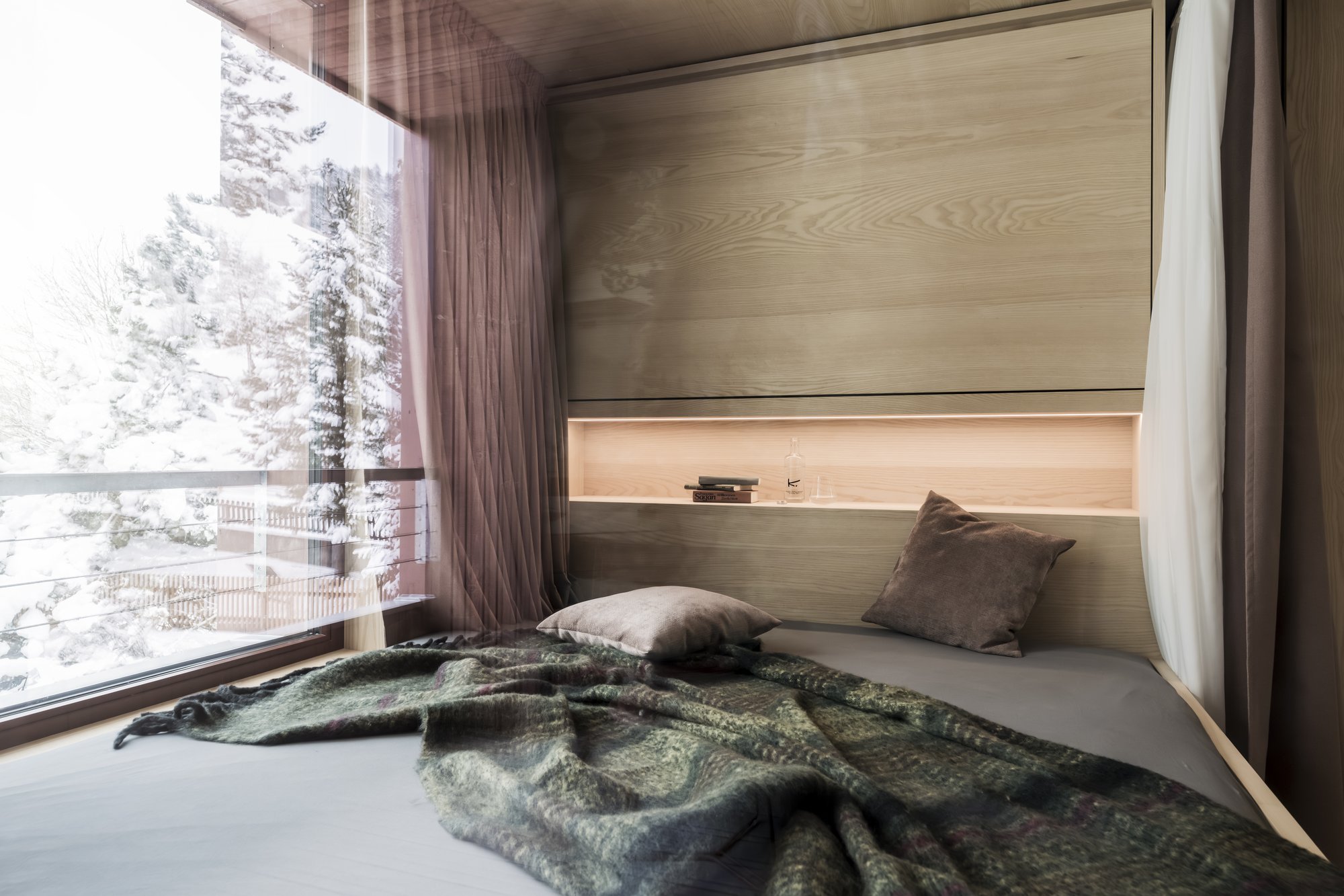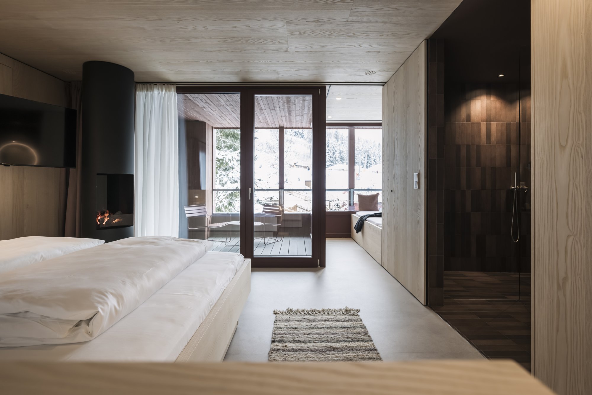 Sei apartsuite dispongono di una sauna privata che, grazie alla parete in vetro, al caldo legno e alla luce soffusa, si integra armoniosamente nello spazio abitativo risultando moderna e accogliente al tempo stesso.