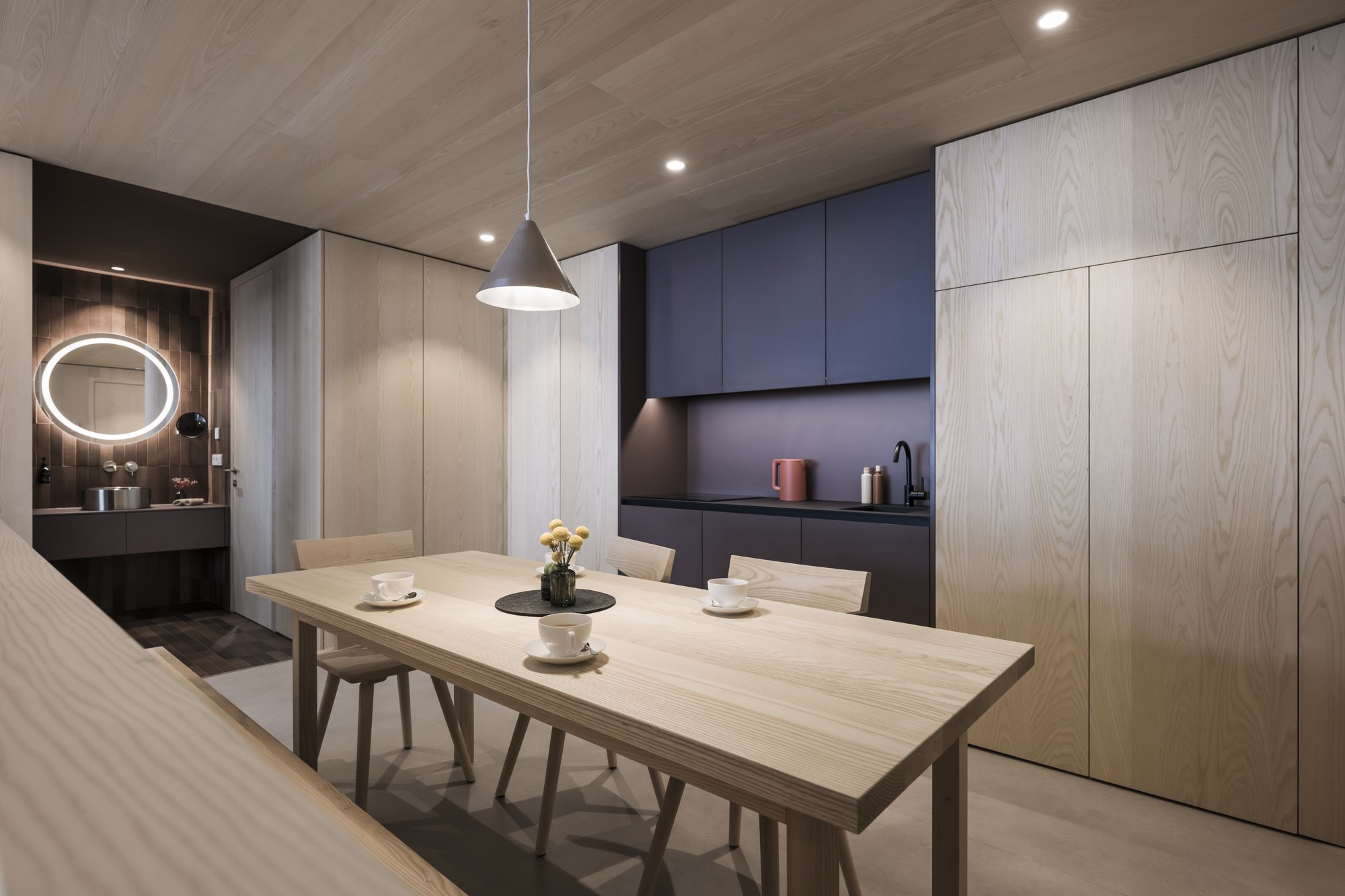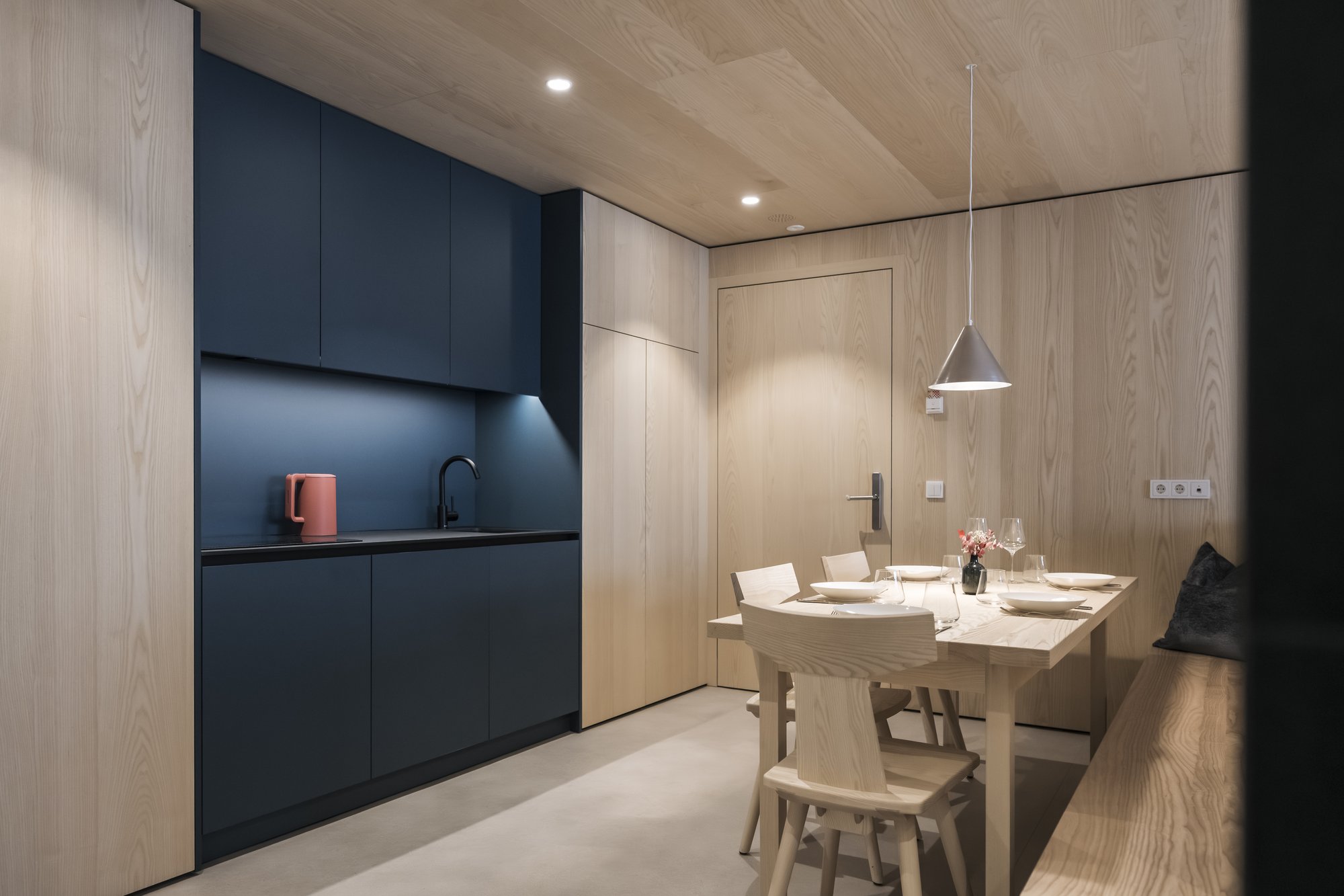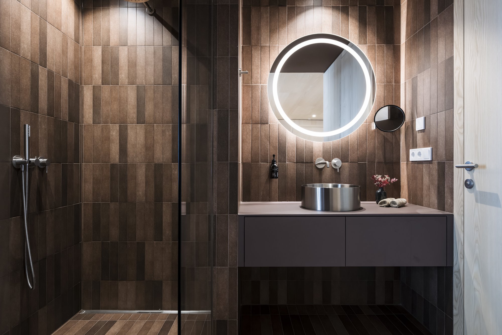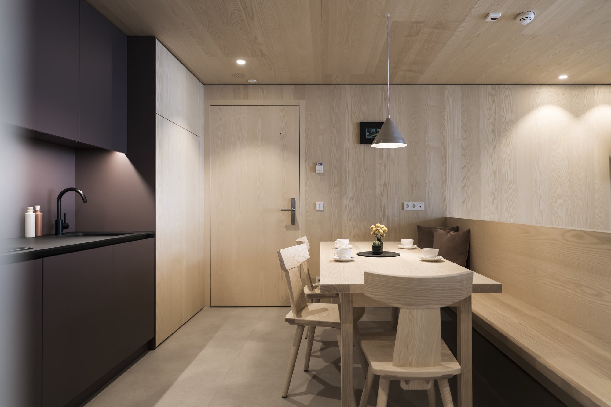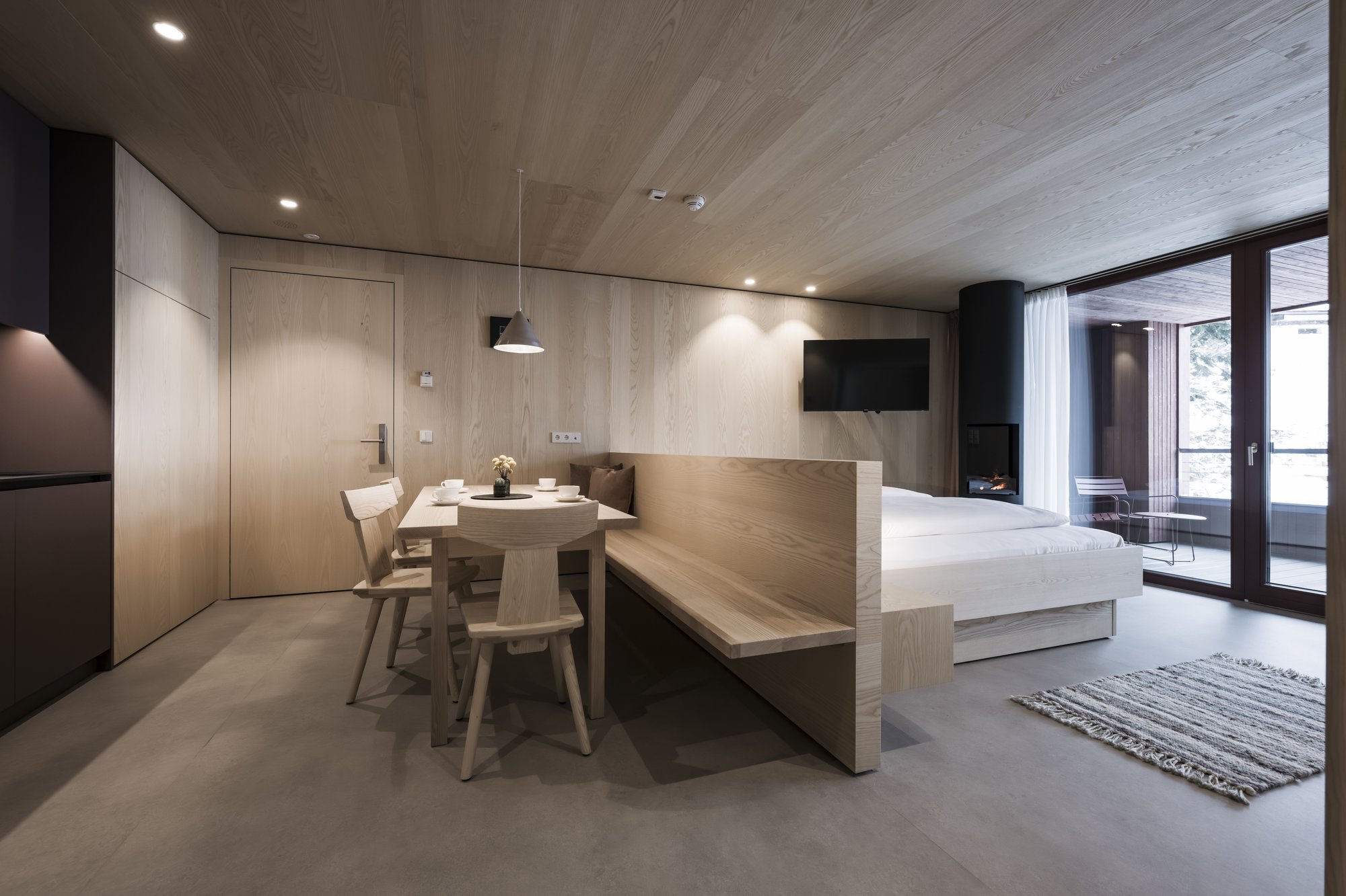 Sei apartsuite dispongono di una sauna privata che, grazie alla parete in vetro, al caldo legno e alla luce soffusa, si integra armoniosamente nello spazio abitativo risultando moderna e accogliente al tempo stesso.
